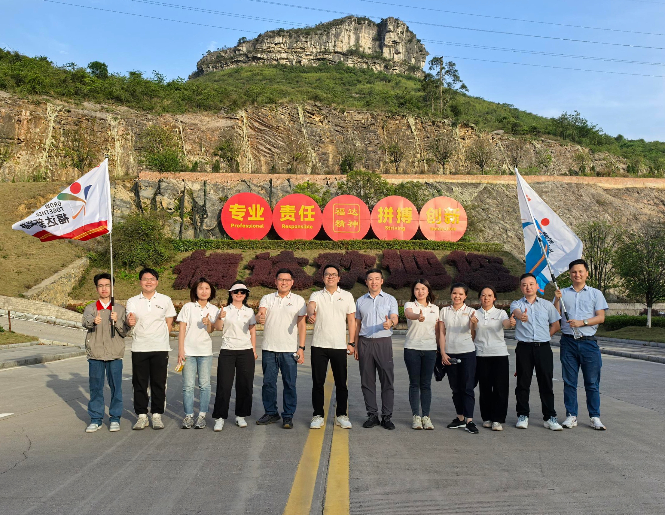 位于公司辦公區(qū)附近的官帽山因其形似古代官帽而得名,在當?shù)厮赜?/span>“登高納福”的吉祥寓意?;顒赢斕?,來自福達青年互學營與新銳營的十余名青年員工代表齊聚山腳。盡管山路未經(jīng)人工修葺,但大家以蓬勃朝氣迎難而上,途中彼此攙扶提醒,于協(xié)作中突破崎嶇路段,最終全員成功登頂。山巔之上,青年們揮灑汗水的身影與迎風招展的旗幟交相輝映,展現(xiàn)出福達青年們昂揚向上的精神風貌。